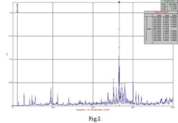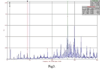 Defectiunile in sistemul de comutatie al motorului au ca efect introducerea de vibratii specifice in intreg sistemul. Prima defectiune are in vedere o pozitionare incorecta a platoului port-perii fata de axa neutra a motorului. Aceasta se manifesta prin aparitia scanteilor sau chiar a unui cerc de foc la contactul dintre perii si colector care provoaca o supraincalzirea si colorare in brun inchis a colectorului. Astfel acestea induc in elementele magnetice ale motorului efecte care se manifesta la valori ridicate ale frecventei(in domeniul frecventei de comutatie a colectorului). In figura 2 este reprezentat spectrul de vibratie asociat unei astfel de defectiuni. Motorul electric de la care s-a prelevat spectrul de vibratii este unul cu o putere de 75kW si Un=440 V. Motorul electric are turatia de 882 rot/min si frecventa fundamentala asociata acesteia de 14,7 Hz. Motorul electric are un colector format din 36 de lamele si un platou cu doua perechi de perii. Frecventa de comutatie este produsul dintre frecventa fundamentala si numarul de lamele ale colectorului, raportata la numarul de perechi de perii de pe platoul portperii. In cazul de fata un calcul matematic simplu indica o freventa de comutatie situata in domeniul frecventei de 265Hz. Acest tip de defectiune se manifesta in spectru de vibratii (acceleratie FFT) prin cresterea amplitudinii in domeniul frecventei de comutatie la valori ridicate(fig.2), dominate fata de oricara alta amplitudine a spectrului, si aparitia benzilor laterale acesteia la cote de peste 25% din amplitudinea fundamentalei. Se mentioneaza ca la o functionare in cote normale armonicile nu depasesc 10 – 15 % din amplitudinea frecventei de comutatie. De asemenea in zonele adiacente frecventelor de comutatie nu se regasesc benzi spectrale, la o functionare normala, acestea situandu-se numai in zona comutatie, crescand usor pana la valoarea acesteai apoi scazind, numarul de benzi spectrale laterale fiind de 4 – 5 benzi de fiecare parte a dominatei(fundamentalei).
