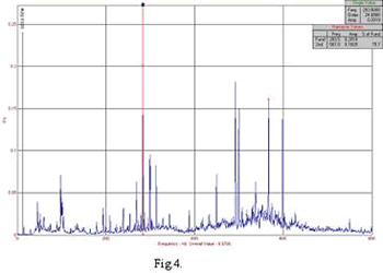 Si defectiunile din categoria contactelor imperfecte dintre perii si colectaorele motoarelor de curent continuu pot fi identificate si diagnosticate prin intermediul spectrelor de vibratii. Astfel in figura 4 este reprezentat spectrul de vibratii in acceleratie – FFT – pentru un motor de curent continuu, de acelasi tip ca cele prezentate anterior, care prezinta contacte imperfecte intre perii si colector. Recunoasterea acestui tip de defect din spectrul de vibratii se face in domeniul armonicilor superioare frecventei de comutatie. De aceea domeniul de colectare a spectrelor de vibratii a fost extins pentru acest caz la 800Hz, fata de cazurile anterioare cand era situat la valorile de 400 – 500 Hz. Aceasta defectiune se manifesta prin aparitia armonicilor suplimentare in spectrele de vibratii, ale frecventei de comutatie pana la 3 – 4 * fc si fara benzi laterale semnificative ale acesteia. Armonicile suplimentare au valori apropiate de frecventa de comutatie, nivelul acestora scazand cu cresterea a multiplilor acesteia. Se mentioneaza ca in figura 4. nu este evidentiata decat armonica a 2-a, domeniul aceasta oferind suficiente informatii privind cauza defectiunilor.