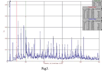 In spectrul reprezentat in figura 5 acest tip de defectiune se manifesta prin aparitia fundamentalei frecventei de alimentare(50Hz) precum si al armonicilor acesteia(pana la a 10-a armonica), cu mentiunea ca una din armonicile 2, 3 sau 6 sunt mai mari in amplitudine decat fundamentala retelei, particularritate care este legata de modul de redresare a tensiunii. Motorul este de acelasi tip ca cele prezentate anterior iar acesta mai prezinta o defectiune, manifestata prin armonici superioare ale fundamentalei frecventei de rotatie, cauzata de o usoara slabire in lagare (joc intre ax si rulment sau rulment si scut) prin aparitia frecventei de rotatie 15Hz (900 rpm) si multiplii acesteia.