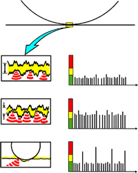 Atunci cand filmul de lubrifiant este gros, nivelul impulsurilor de soc este scazut, fara varfuri semnificative (zona verde). Nivelul creste atunci cand grosimea filmului de lubrifiant scade, dar nu sunt prezente inca componente de amplitudine semnificativa (zona galbena). Uzura cauzeaza impulsuri puternice la intervale neregulate (zona rosie).